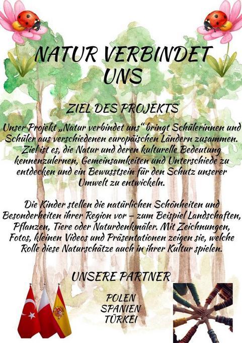 W tym roku szkolnym nasza szkoła rozpoczęła projekt e-Twinning pod nazwą „Natur verbindet uns” - „Łączy nas natura”. Wszystkie działania realizowane są w języku niemieckim. Partnerami przedsięwzięcia są: szkoła Sant Gervasi z Mollet del Vallès (z Hiszpanii),a także szkoła Kemer Uğur Ortaokulu z Kemer (z Turcji). Celem projektu, oprócz nabywania i wykorzystania w praktyce umiejętności językowych, jest poznanie tajników natury krajów europejskich i jej wpływu na kulturę. W trakcie rocznej pracy uczniowie będą wyszukiwać podobieństwa i różnice pomiędzy środowiskami naturalnymi Polski, Hiszpanii i Turcji, a także rozwijać świadomość na temat ich ochrony. Projekt skierowany jest do wszystkich dzieci naszej szkoły, natomiast większość zadań realizuje grupa z klas 7, uczących się języka mniejszości narodowej. We wrześniu, wspólnie z uczniami z trzech szkół, został opracowany plan pracy na cały rok szkolny, ponadto uczestnicy założyli swoje konta na stronie projektu i stworzyli swoje awatary profilowe. W październiku powstały wizytówki i wiadomości głosowe, które również zostały tam umieszczone. Planowane zadania na ten rok szkolny obejmują między innymi: wideokonferencję pomiędzy naszymi szkołami, kontakt między uczniami poprzez czat projektu, a także stworzenie prezentacji o pomnikach przyrody. Wszystkie materiały umieszczane zostają na stronie projektu Europejskiej Platformy Edukacji Szkolnej.