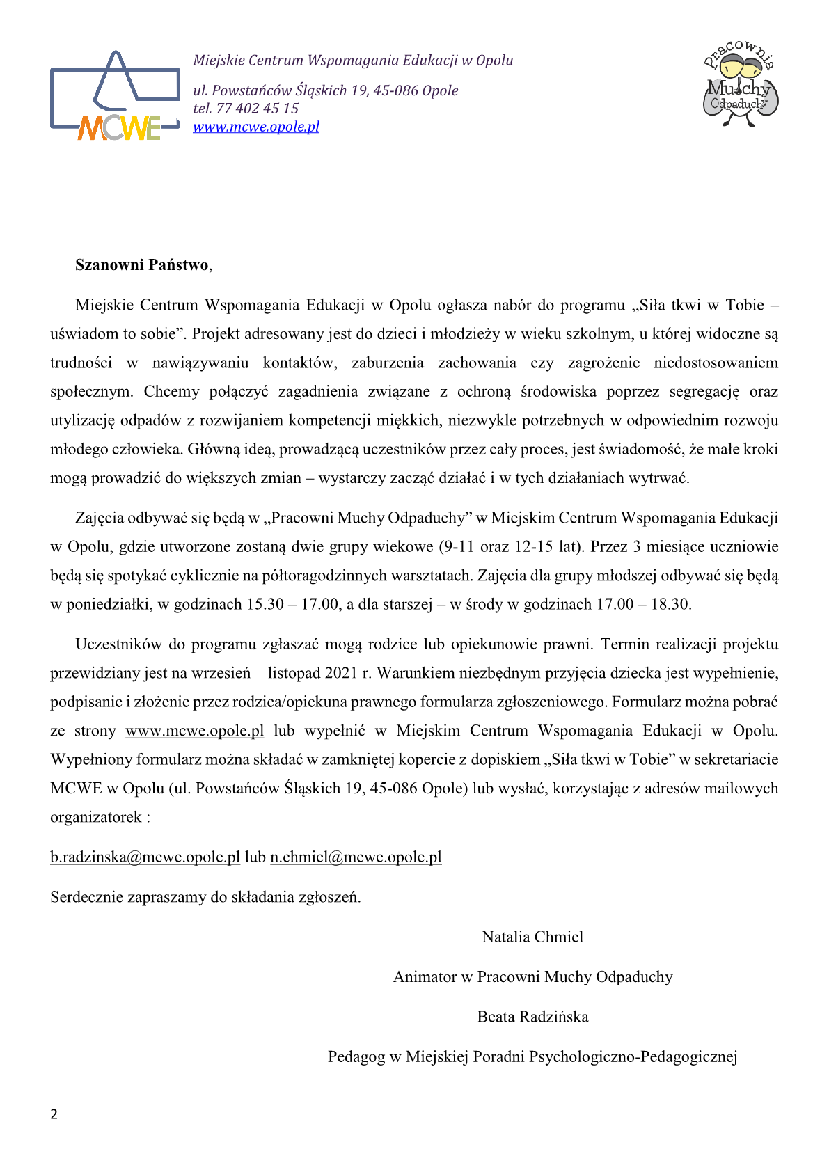 Zapraszamy do zapoznania się z projektem realizowanym przez Miejskie Centrum Wspierania Edukacji pt." Siła tkwi w Tobie - uświadom to sobie".