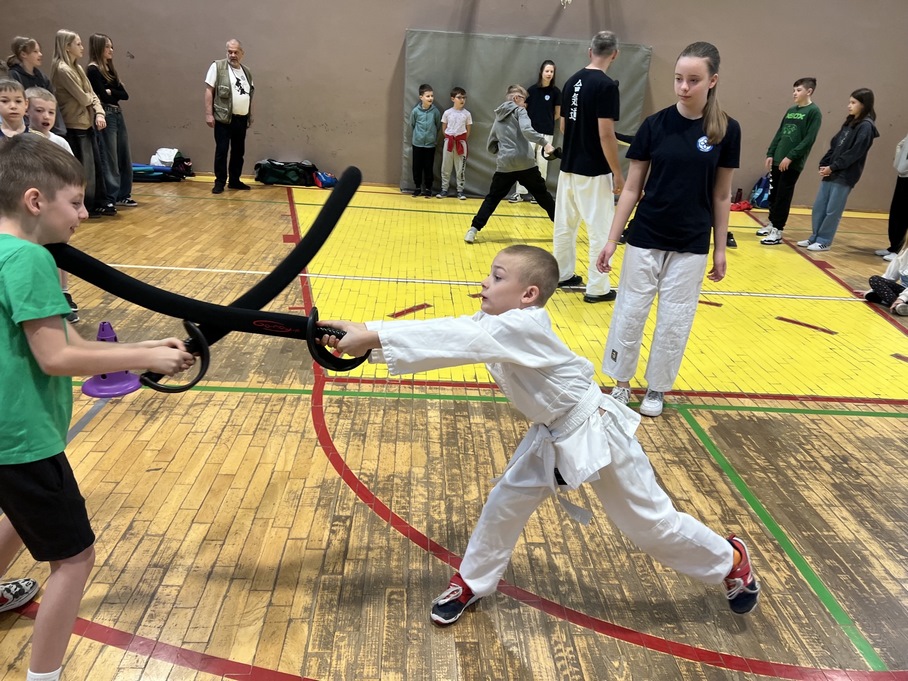 W dniach 09-10.04. w naszej szkole gościliśmy instruktorów sztuk walk z Klubu Przyjaciół Aikido, którzy dzielili się z nami swoją pasją i wiedzą związaną z walką na różnego rodzaju miecze. Po krótkiej pogadance dotyczącej bezpiecznego korzystania ze sprzętu odbyły się pokazy walk, które zrobiły na nas ogromne wrażenie. Następnie uczniowie mogli sami spróbować swoich sił w tej dyscyplinie. Emocje towarzyszące pojedynkom były niesamowite. Wszyscy chcieli doświadczyć na własnej skórze starcia indywidualnego z kolegą czy koleżanką. Na koniec spotkania odbyły się walki drużynowe, które podgrzały atmosferę sportową na sali gimnastycznej do tego stopnia, że na udział zdecydowali się nawet obecni nauczyciele.