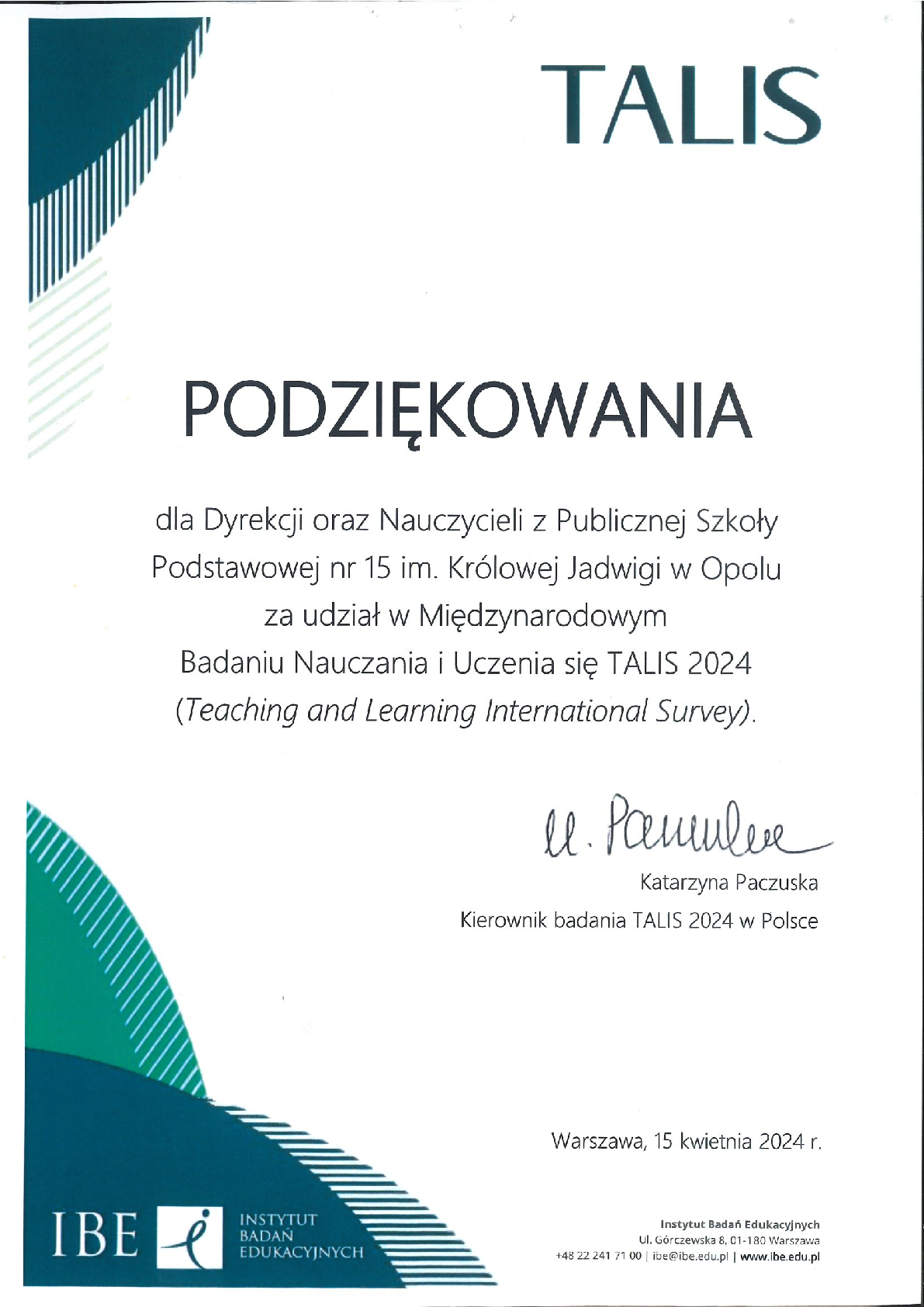 12 marca 2024r. w Filharmonii Opolskiej odbył się koncert jubileuszowy „Sukces to wspólne trwanie i działanie. Symfonia twórczości” z okazji XX-lecia działalności Stowarzyszenia Szkół Innowacyjnych Regionu Opolskiego. PSP 15 należy do Stowarzyszenia od początku jego powstania. Głównym zadaniem Stowarzyszenia jest wspieranie dyrektorów i nauczycieli we wszystkich działaniach na rzecz podnoszenia jakości nauczania i wychowania oraz poprawy pracy w szkołach regionu opolskiego.