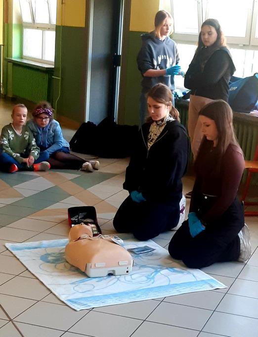 Pierwsza pomoc dla uczniów klas czwartych przygotowujących się do karty rowerowej. Pokaz poprowadziły dziewczęta ze SK PCK, dzieląc się swoją wiedzą i doświadczeniem.