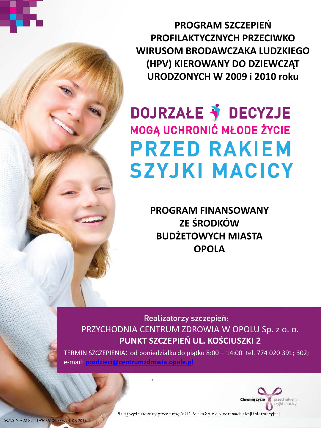 Przypominamy o kontynuacji realizacji programu szczepień przeciwko wirusowi , który jest finansowany z budżetu Miasta Opola i dotyczy dziewczynek urodzonych w 2009 i 2010 roku.