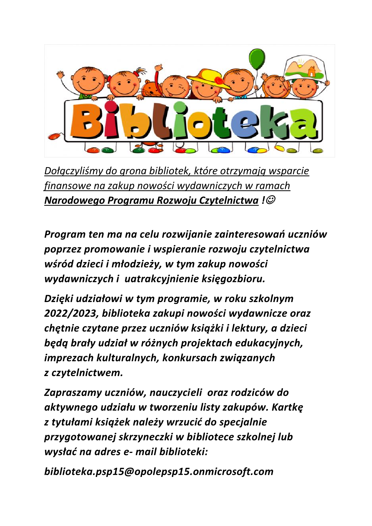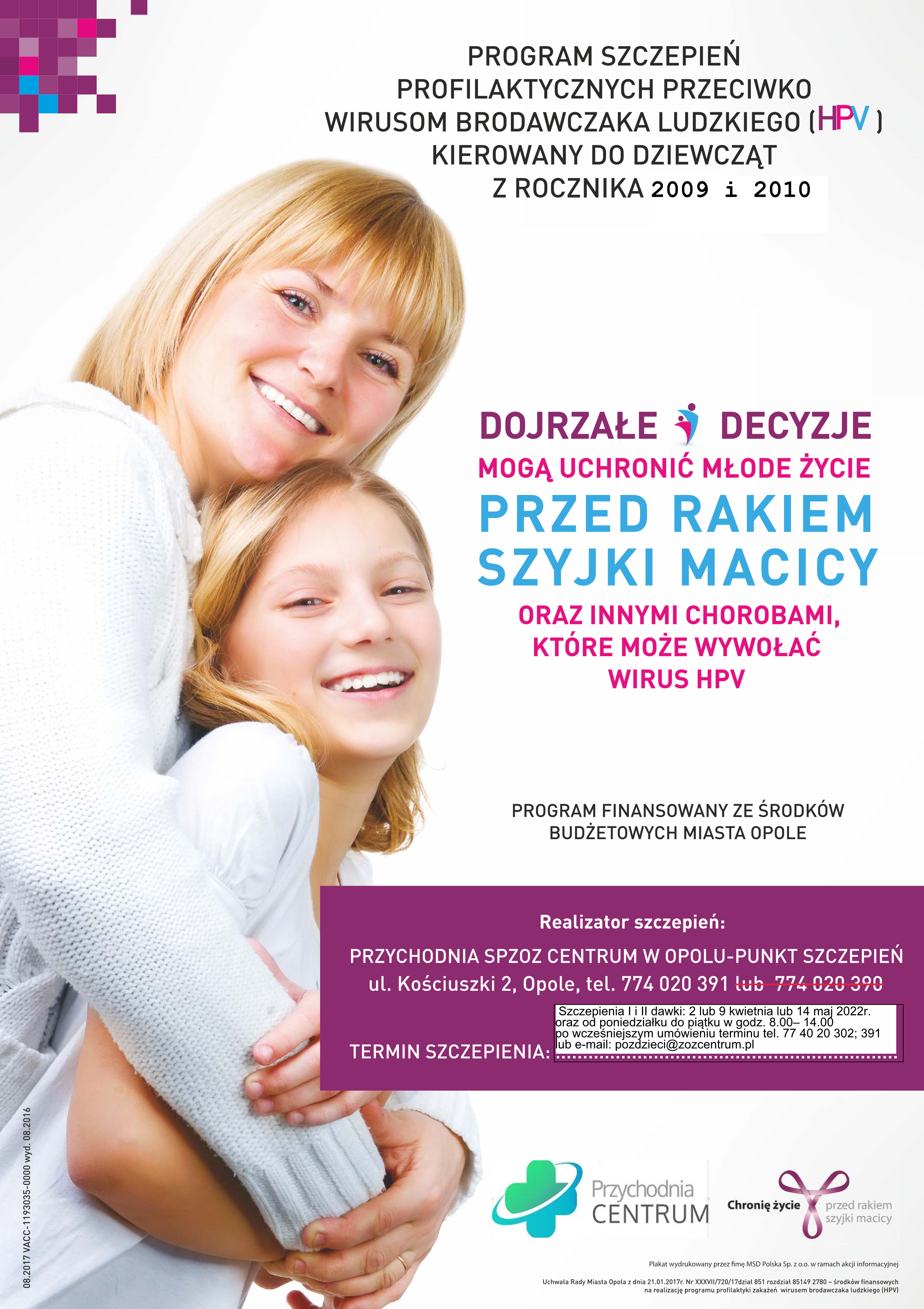 Informujemy o realizacji programu szczepień przeciwko wirusowi HPV, który jest finansowany z budżetu Miasta Opola i dotyczy dziewczynek urodzonych w 2010 roku. Akcja szczepień prowadzona jest w Samodzielnym Publicznym Zakładzie Opieki Zdrowotnej "Centrum" w Opolu przy ul. Kościuszki 2 (punkt szczepień). Dodatkowych informacji na temat akcji szczepień udzielają pracownicy SP ZOZ "Centrum" - telefon 77 40 20 391 lub 77 40 20 390. Jednocześnie informujemy, że szkoła nie pośredniczy w zapisach, ani nie przekazuje zgód na szczepienie.