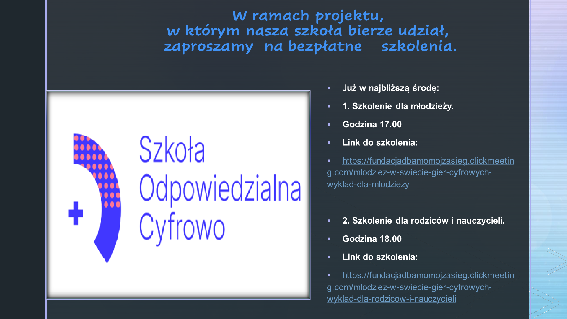 Projekt jest skierowany do dzieci w wieku 9-15 lat.