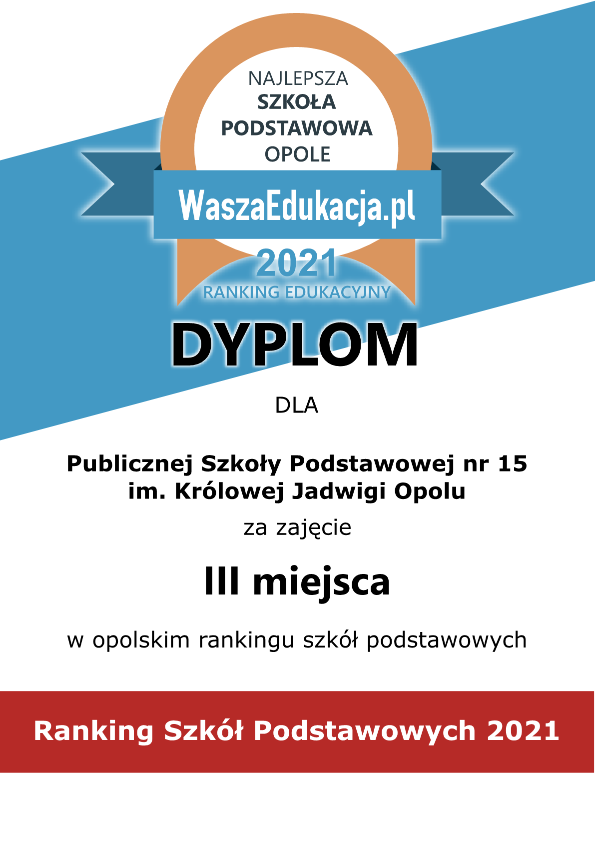 Miło nam zakomunikować, że nasza szkoła w rankingu przeprowadzonym przez portal WaszaEdukacja.pl zajęła III miejsce wśród szkół podstawowych z Opola.