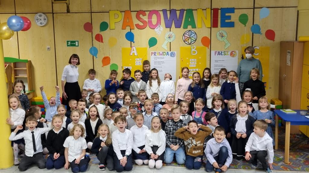 25.01.2023r. odbyło się uroczyste pasowanie na Świetlika. Pani Ola i Pani Patrycja przygotowały kilka zadań. Zabawa „Prawda-Fałsz” rozpoczęła zmagania i sprawdziła znajomość regulaminu świetlicy. Najwięcej radości wzbudziło zadanie z matematyki. Działania zostały ukryte w balonach, aby je rozwiązać najodważniejsi przedstawiciele klas pierwszych musieli przebić balon, z którego wystrzeliło kolorowe konfetti. Kolejne punkty uroczystości były skierowane na sprawdzenie wiedzy z innych dziedzin. Następnie przy akompaniamencie gitary został odśpiewany hymn świetlicy. Po skończonych zadaniach i uroczystym ślubowaniu pani kierownik włączyła pierwszoklasistów do grona świetlicowej gromady. Ten dzień zapamiętamy na długo.