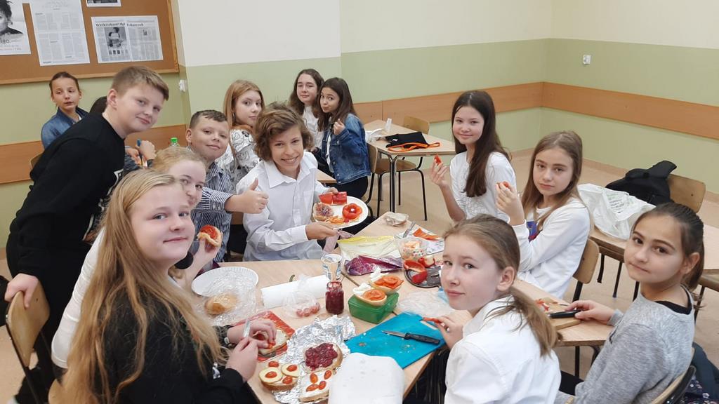 08.11.2019r. po raz drugi zorganizowaliśmy akcję pt. „ŚNIADANIE DAJE MOC”. Podczas imprezy uczniowie wszystkich klas zostali uświadomieni, że śniadanie to najważniejszy posiłek dnia, dzięki któremu mają energię do nauki, lepiej koncentrują się podczas lekcji oraz mają dużo siły do zabawy. Dowiedzieli się również, że zdrowe odżywianie to nie tylko zdrowa żywność, ale że ważne jest też, by jeść pięć posiłków w ciągu dnia o stałych porach i bez pośpiechu. Trzeba pamiętać o piramidzie zdrowego odżywiania, w której należy systematycznie sięgać po nabiał, ryby i mięsa oraz ciemny chleb zamiast bułek, a także o piciu wody czy soków zamiast szkodliwych napojów gazowanych. Mowa była też o niezbędnym ruchu oraz o unikaniu słodyczy i chipsów, które nie są zbyt zdrowe. Uczniowie przede wszystkim w praktyczny sposób wykonywali zdrowe śniadanie z produktów przyniesionych z domu w kolorach biało-czerwonych. Były to między innymi: kanapki, koktajle, przystawki itp. W przygotowaniach wsparli nas oczywiście rodzice uczniów, którym serdecznie dziękujemy. Na lekcjach wychowawczych poprzedzających akcję „Śniadanie daje moc” uczniowie wykonywali prace plastyczne, plakaty i układali hasła- rymowanki. Akcja dała uczniom nie tylko wspaniałą zabawę, ale również szansę na integrację klasy, zwiększenie świadomości na temat zdrowego odżywiania i roli śniadania w diecie człowieka. Wszystkie te działania z pewnością przyczyniły się do utrwalenia zdrowych nawyków żywieniowych naszych uczniów, ale również wzmocniły integrację szkolnej społeczności.