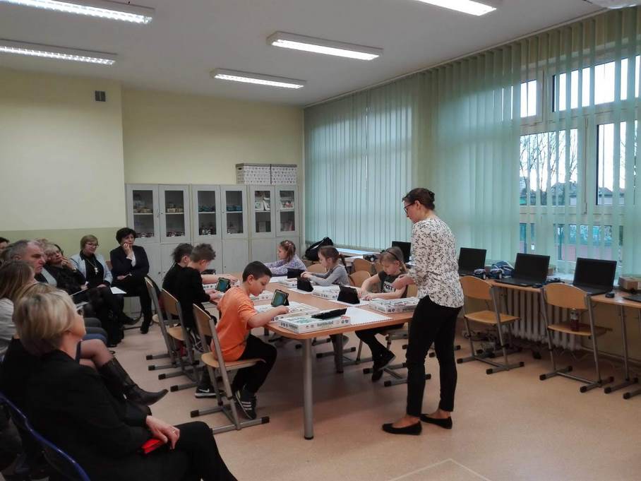 W środę, 13 marca, gościliśmy w naszej szkole dyrektorów opolskich szkół podstawowych na lekcji pokazowej z wykorzystaniem naszych najnowszych pomocy dydaktycznych IT. Jako jedna z dwóch opolskich szkół otrzymaliśmy od Miasta Opola nowoczesne wyposażenie do pracowni informatycznej. Zajęcia pokazowe prowadzili nauczyciele naszej szkoły: p. Aleksandra Halupczok z klasą 2b i p. Tomasz Kaczmarek z klasą 6b oraz p. Sławomir Górniak – konsultant ds. nauczycieli informatyki z Miejskiego Ośrodka Doskonalenia Nauczycieli. Starsi uczniowie i uczennice prezentowali swoje umiejętności programowania mBotów i zaprezentowali mecz piłki nożnej robotów. Czternaście takich robotów oraz laptopów jest już w nowej pracowni informatycznej, dzięki czemu lekcje programowania w starszych klasach są atrakcyjniejsze i coraz bardziej efektywne.