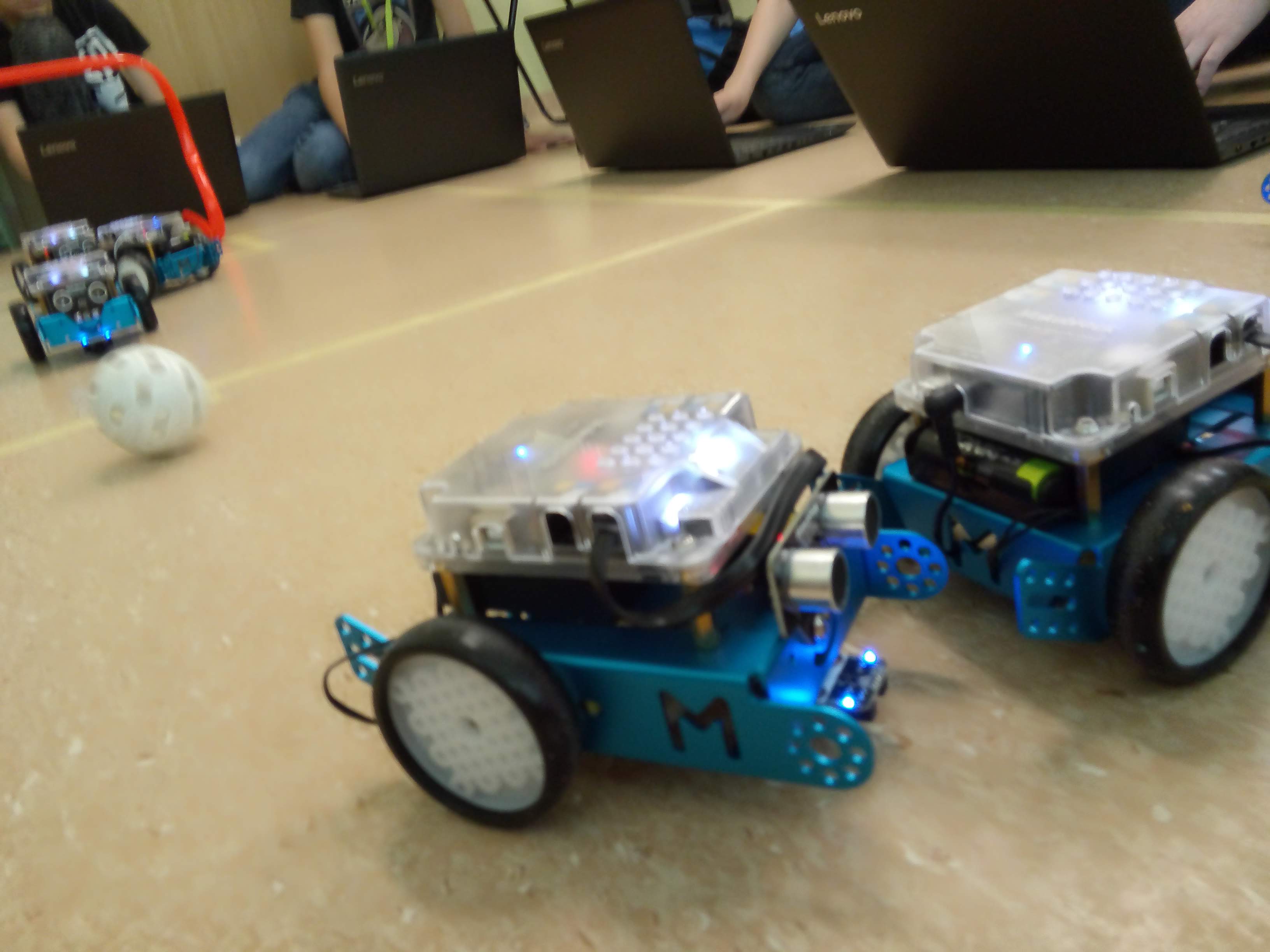 Lekcje programowania w starszych klasach zyskały w naszej szkole nowy praktyczny wymiar dzięki Robotom Makeblock – mBot 1.1. Można nimi sterować za pomocą pilotów, tak by poruszały się w dowolnych kierunkach. Dzięki podwójnemu czujnikowi linii mBoty jeżdżą także po narysowanych lub wydrukowanych trasach, podobnie jak Ozoboty. Te rozwiązania podobają się jednak głównie uczniom klas młodszych. Ci starsi wydają robotom polecenia, komunikując się z nimi poprzez bluetooth lub kabel USB w wizualnym – blokowym języku programowania Scratch. Uczą się więc podstawowych pojęć algorytmiki, układając (jak puzzle) proste algorytmy na darmowej internetowej platformie ozoblockly.pl, a ich poprawność mogą sprawdzić w praktyce właściwie natychmiast, przesyłając je do pamięci mBotów. Roboty oprócz odbiornika podczerwieni i czujników linii posiadają również m.in. czujniki: ultradźwiękowy, odległości, światła, temperatury i kolorów oraz wyświetlacz i diody RGB, dlatego układane przez uczniów algorytmy nie muszą opisywać wyłącznie ruchu mBotów. Można je zaprogramować tak, by mierzyły temperaturę w sali, omijały przeszkody, mierzyły odległość, zmieniały kolory w określony sposób czy rozegrały mecz piłki nożnej, a to zaledwie kilka przykładów możliwości wykorzystania robotów. Ponadto mBoty są kompatybilne z klockami LEGO, więc można je łączyć z naszymi szkolnymi zestawami LEGO WeDo. Programowanie na monitorach laptopów nie jest już więc nudne i trudne. Uczniowie bawiąc się, kształtują myślenie komputacyjne, algorytmiczne oraz rozwijają kreatywność i samodzielność.